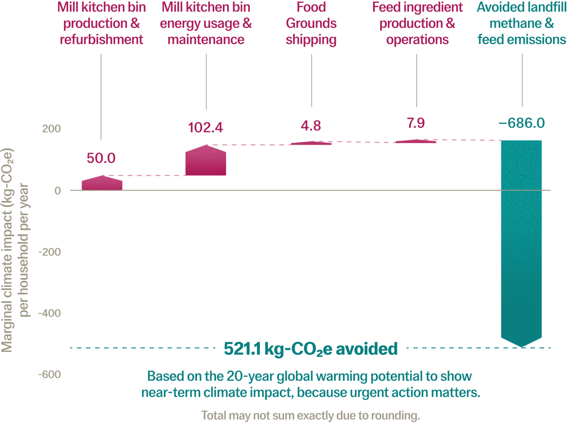 Based on our study, you can avoid about a half-ton of greenhouse-gas emissions per year with Mill. Instead of filling the air with methane, your kitchen scraps go right back into the food system.
